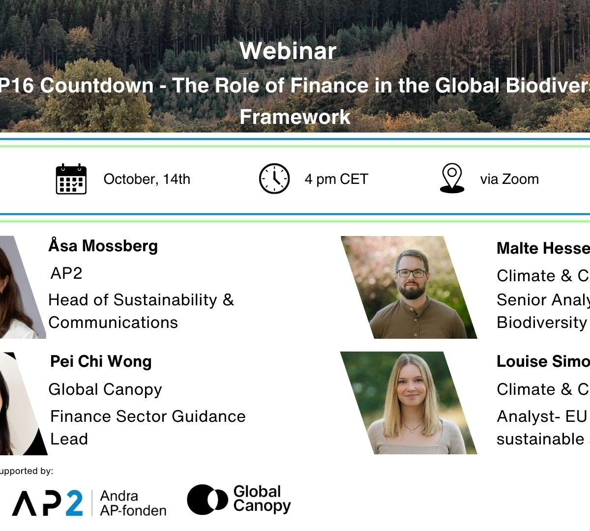 September 23, 2024 - Climate & Company, in partnership with Global Canopy and Swedish Pension Fund AP2, will host a webinar to explore the intersection of finance and biodiversity, using the example of deforestation, a biodiversity issue that has seen significant progress over the last decade. The webinar will focus on accelerating action with existing data and tools, as well as potential policy interventions.